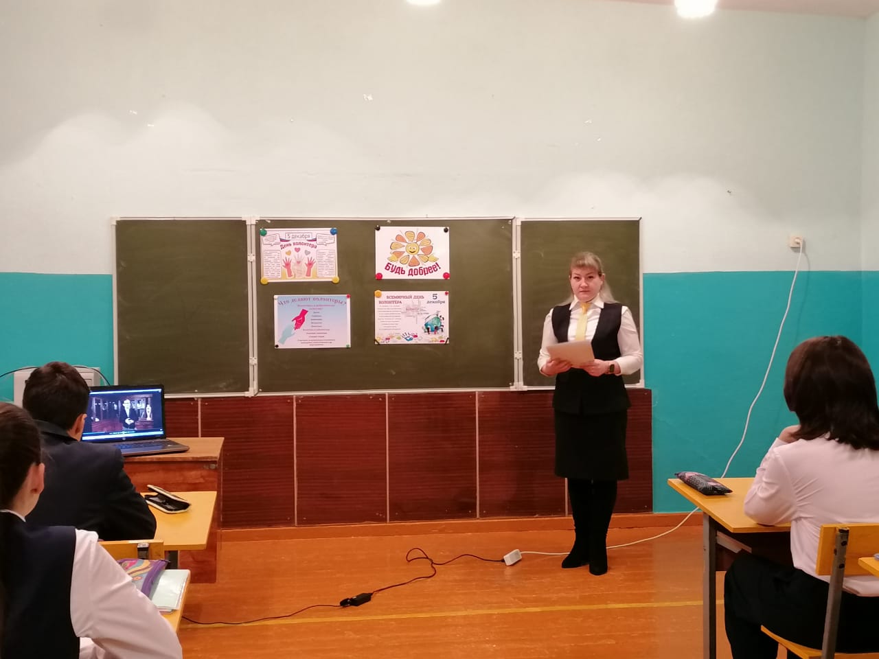 Советником директора по воспитанию и взаимодействию с детскими общественными объединениями было проведено внеурочное занятие для обучающихся 8 класса «Жить – значит действовать». Цель занятия: формирование представления о жизни как проявлении себя в различных видах волонтёрской деятельности, воспитание нравственных качеств личности (доброта, милосердие, сострадание, благородство, готовность прийти на помощь).
