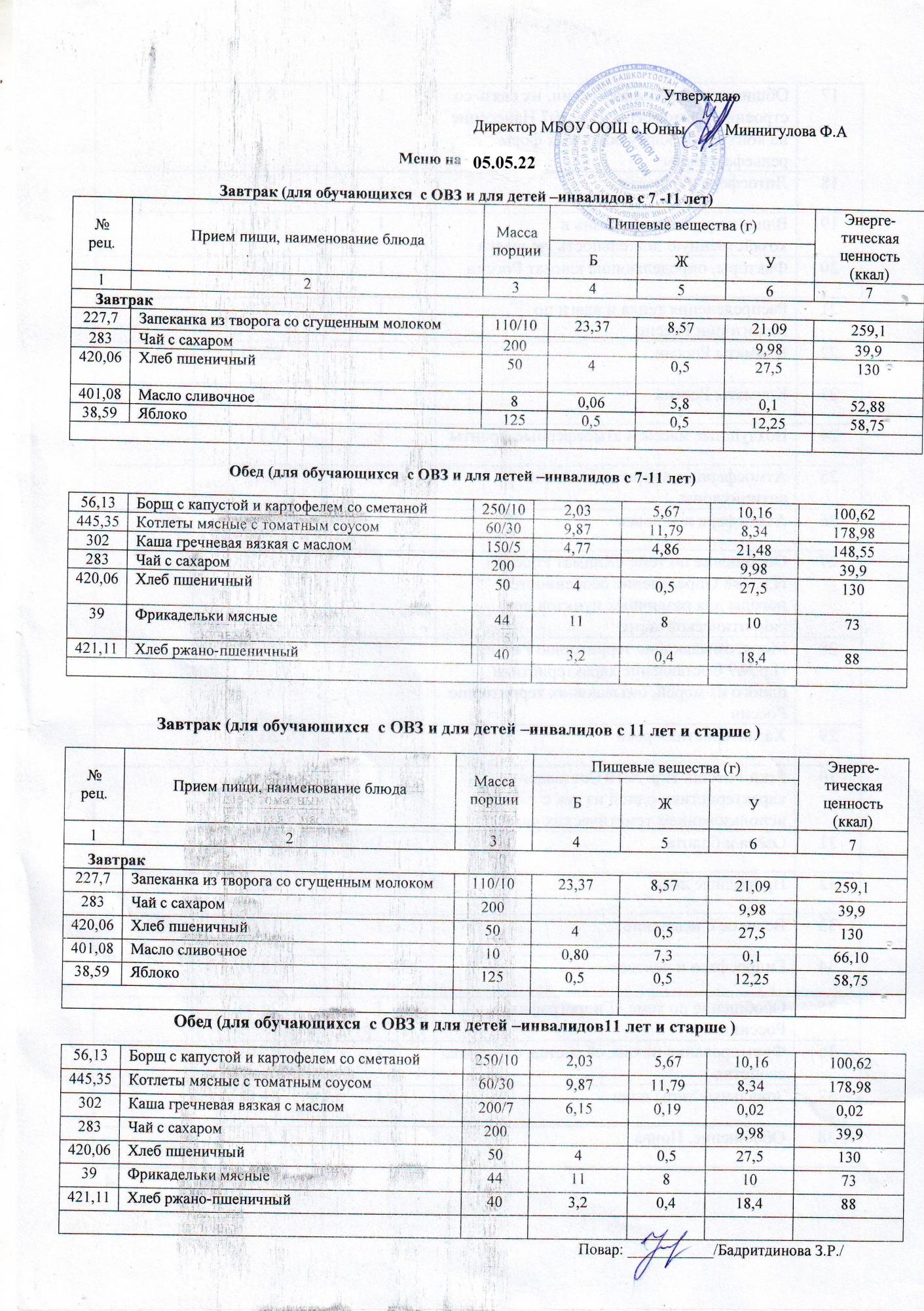 Меню ОВЗ 05.05.2022