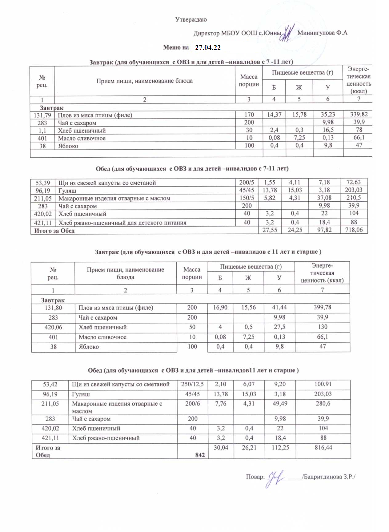 Меню ОВЗ 27.04.22