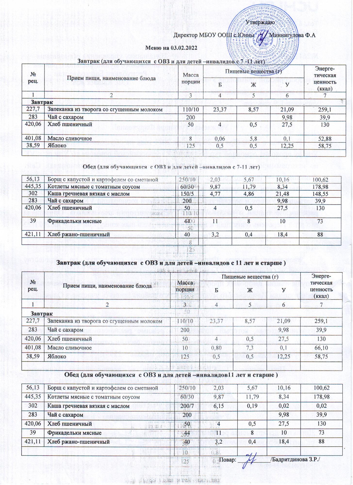 меню ОВЗ 03.02.2022